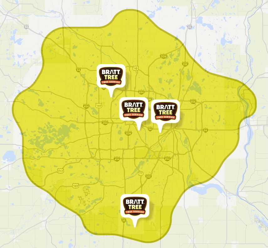 Bratt Tree is rooted in the heart of Minneapolis and Saint Paul — and we branch out far and wide. Our service area covers a wide range of neighborhoods and suburbs, including Edina, Bloomington, Woodbury, Golden Valley, Burnsville, Cottage Grove, and White Bear Lake. Wherever you are in the metro, our certified arborists are just a call away. Explore our full service map and see why communities across Minnesota trust Bratt Tree for dependable, professional tree care.